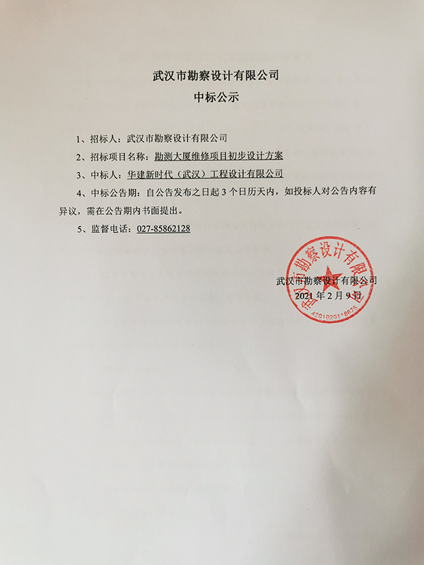 武漢市勘察設計有限公司勘測大廈維修項目初步設計方案中標結果公示
