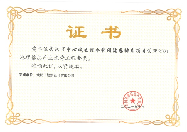 公司以實施水環境治理項目為契機,積極開展各項規范標準編制、探索行業新技術,為武漢市流域治理及水環境提升工作提供了詳實可靠的數據成果和堅實有力的技術支撐。公司聯合武漢市水科院、市測繪研究院等合作單位,共取得發明專利2項、新型實用專利1項,軟件著作權8項,編制地方標準2項、參編團標4項、專著1份、論文5篇。其中,“武漢市中心城區排水管網隱患排查項目”及“青山區北湖流域本底調查項目”憑借著精湛的項目管理、先進的技術手段、優良的數據成果及多項科研成果榮獲2021中國地理信息產業優秀工程金獎。